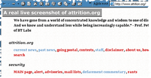 Attrition now uses stylesheets on new pages to take advantage of basic margin setting, font setting, and other elements that make updating the pages easier. So no, we haven't abandoned our text ethic, just streamlined it a tad to make web updates easier on the staff and our readers. As I have demonstrated, you can pretty much apply a huge level of control to the way these, and any other web pages display if you use a relatively modern browser, and any crying about red links, white text, and black backgrounds will be completely ignored.