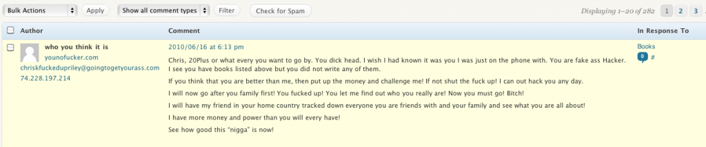 The full text of the comment, written by "who you think it is" / younofucker.com, chriskfuckedupriley@goingtogetyourass.com / 74.228.197.214 reads: