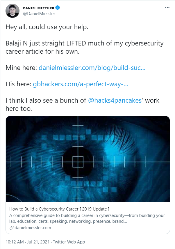 On July 21, 2021, Daniel Miessler Tweeted that one of his articles had been plagiarized. He called out Balaji N of GBHackers as the person responsible. The plagiarized material was deleted quickly but had already been mirrored on Archive.org. Miessler also mentioned that it appeared that other blogs also contained plagiarized material, indicating it was a pattern. Claus Houmann replied to the thread saying that the GBHackers had a history of stealing content from other sites as well.