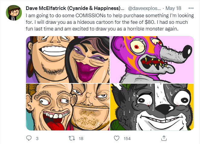 It started with Lazlo, then many years later came Lezlo and Lolzo. Last year we noticed Dave McEflatrick from Cyanide & Happiness fame offering to do commissions, presumably to purchase meth and crayons.