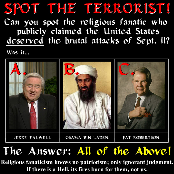 From: nos (nos@granite.net.au) To: jericho@attrition.org Date: Thu, 31 Jan 2002 08:22:34 +1030 Subject: Spot the terrorist With regards to the pic in your gallery called spot the terrorist - I don't think it's very funny Simply because america did deserve the self-inflicted attacks of 9/11. look att the fabrications since - fake obl tape, mistranslated notes etc etc Mossad knowing beforehand. The afghan oil-line etc etc 9-11 was a setup from the inside to justify the afghani 'peace'/oil mission - read enron letter from michael moore \|