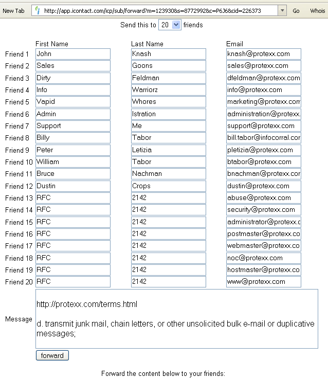 From: security curmudgeon (jericho@attrition.org) To: knash (knash@protexx.com), sales@protexx.com Cc: dfeldman@protexx.com Date: Fri, 21 Mar 2008 07:05:53 +0000 (UTC) Subject: Re: 2008 IT survey : Are your clients concerned about data and identity security? As much as they are about unwanted spam. : If you would like to participate in future survey's or if you would like : to receive more information : [http://www2.protexx.com/affiliates/index.html?w=RESPONSE10&p=P1026] Click : Here. You can also email Protexx at [mailto:sales@protexx.com] : sales@protexx.com. I'd like to let you know one thing and request another. FYI: You mailed this to our errata address, which is a tad ironic given that the http://attrition.org/errata/ section deals with security companies who send unsolicited mail. You'll be seeing yourselves up there when we get a few spare minutes. Request: Remove all addresses related to 'attrition.org' from your spam list. : This message was sent by: Protexx, Inc., 10 Fairway Dr, Deerfield Beach, FL 33441 This message was NOT sent in compliance with the CAN-SPAM act and violates federal law. How exactly does a potential customer trust your company after this? : Powered by iContact: http://freetrial.icontact.com Who doesn't believe in truth-in-advertising obviously, as you can not track the "opens, clicks and more" when you send this mail to many security professionals, who do not use point-and-drool mail clients. : Forward to a friend: : http://app.icontact.com/icp/sub/forward?m=123930&s=8772992&c=P6J6&cid=226373 Ok, I will!