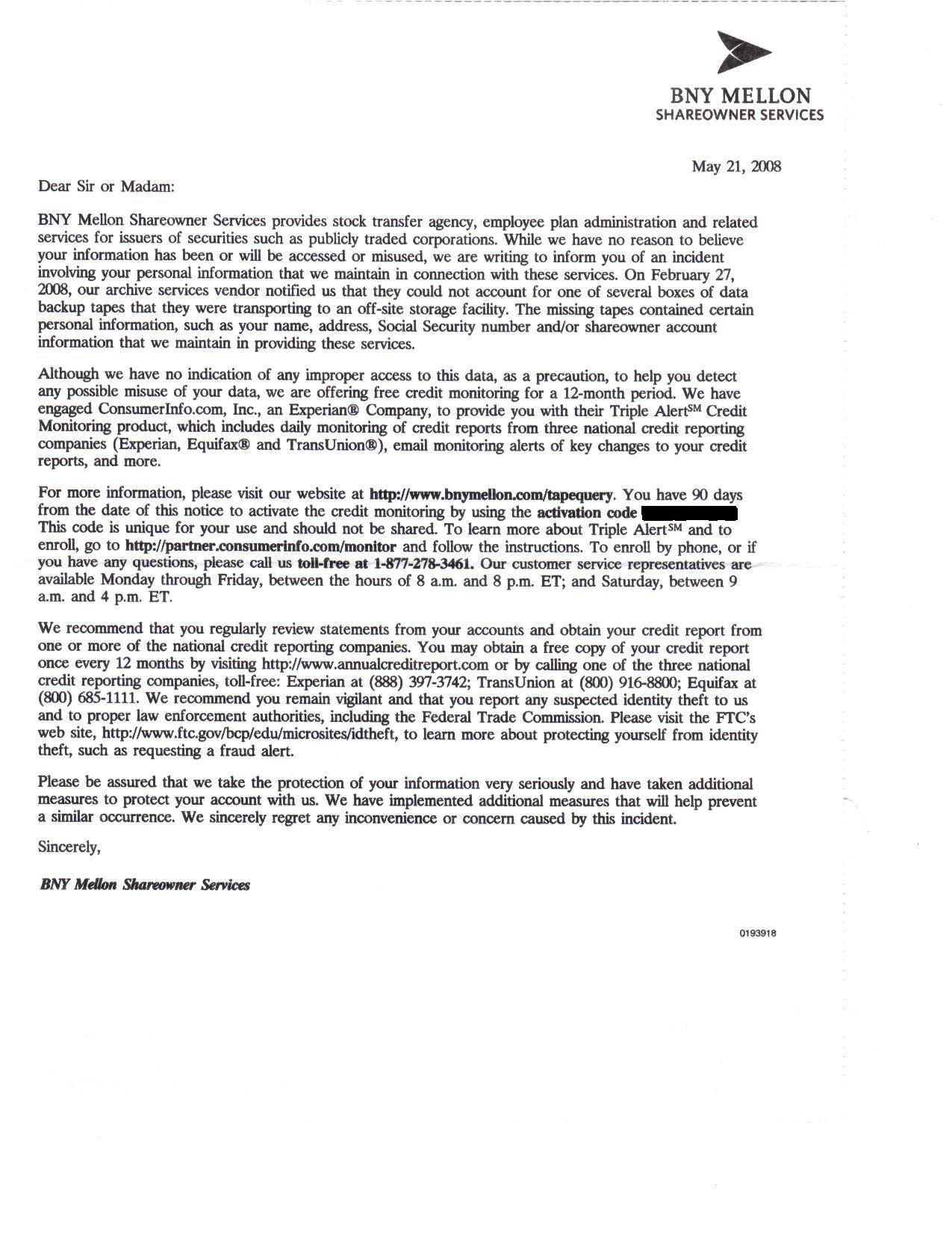 If you have been the victim of a data loss incident, odds are you have received a letter from the careless organization that lost your information. These letters always offer apologies and sincere hope that your identity or personal information isn't abused. The recent BNY Mellon incident (which now stands at 4.5 million potential customers affected) resulted in customers receiving such a letter: