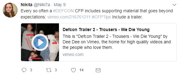 From: d2d_protonmail.com To: nikita_defcon.org Subject: Re: DEF CON 25 CFP submission Where's my acceptance letter? Trailer vid in case you aren't sold: https://vimeo.com/216177156 Love, d2d